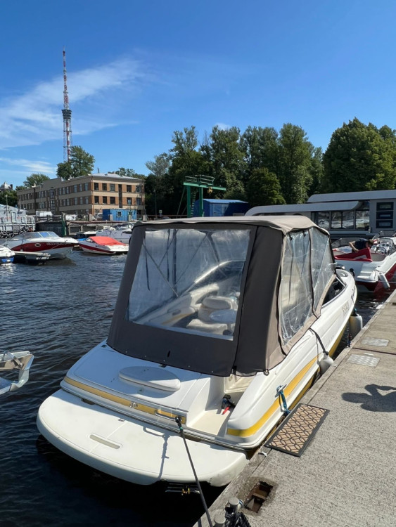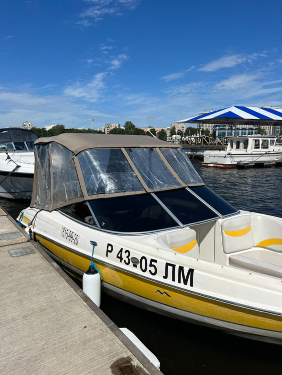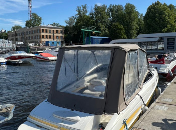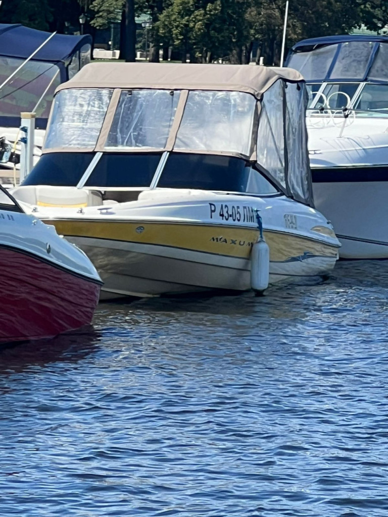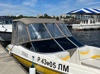 Тент ходовой для катера MAXUM Материалы: - Ткань Sunbrella - ПВХ прозрачный 0,75мм - кнопки катерные WASA. Стоимость 85 000 руб. На фото стекло обклеено транспортировочной стрэйч пленкой.